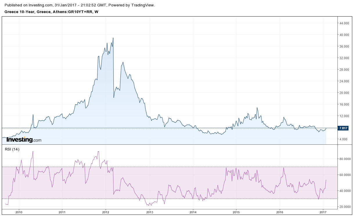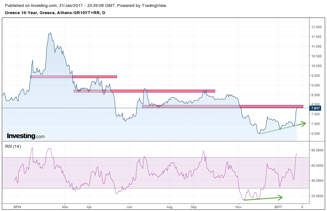 - Since November, the 10-year Greek bond has been trending upwards. Note the higher lows that help drawing the ascending trend line.