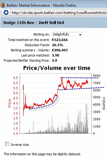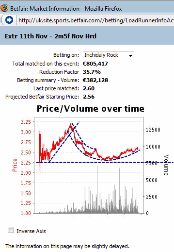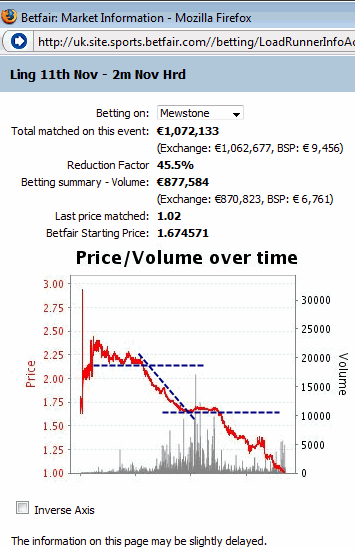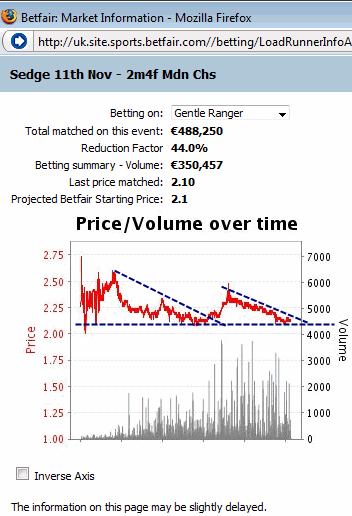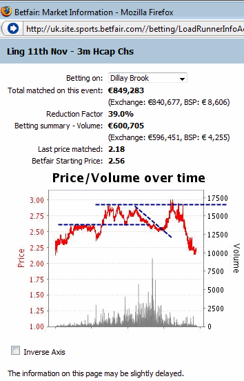 At the 13:00 race the Betfair chart shows the odds movement even after the start of the race just a few seconds before the horses cross the finish line. In the beginning of the graph the odds have met support at about 2.20 and they find it difficult to fall below it, although the highs are getting shorter and shorter. That is a major indication that there will be a strong trend as soon as the support level is broken. Indeed, the odds movement proves that and the odds reach 1.65 in just 2 minutes’ time and all that BEFORE the horse race starts. That happened when the support level at 1.65 was broken. If you ask me whether we can apply technical analysis in trading in-play horse racing markets I won’t answer that now. But if you dare try it and you are quite fast in trading, you might succeed.