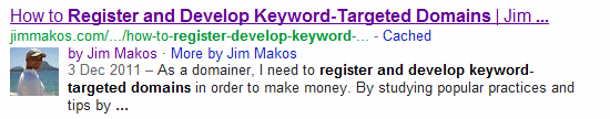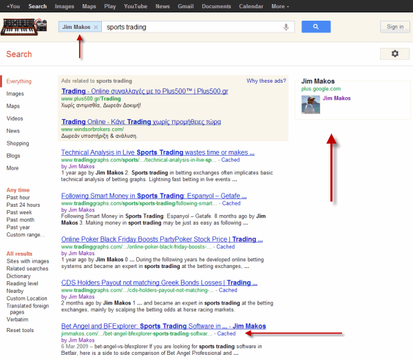 Since I own several blogs, Google is able to show all of my posts right at the web search page! Say a random search brings up a post written by me. Clicking on “More by Jim Makos” will load a new search result page featuring all of the articles Google has found authored by me! Then people can search any term they like and find out if I have posted something similar. For example, I searched for “sports trading” and posts from both of my blogs appear in the results’ page! There’s also my Google Plus profile page at the right column, driving people to add me in their circles!