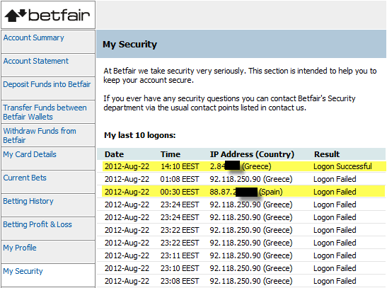 Betfair does offer some kind of security. It’s a security tab in your account details. Betfair customers can find out if their accounts have been accessed by someone else. The security tab includes the last 10 or so IPs their account has been accessed from. So, for instance if they live in UK and they see an IP from another country, that should raise flags.