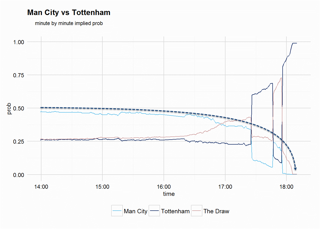 The same pattern is evident for the home team in Manchester City vs Tottenham chart (FT: 1-2). Yes, draw odds were drifting a bit but in general, we should ignore the price action of the draw’s line unless it shortens quite a lot (think of 3.30 shortening to 2.50 or lower).