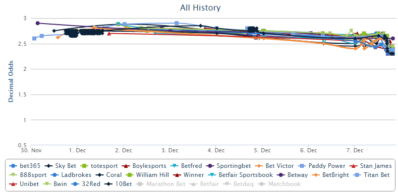 Now, let’s see the actual betting markets around the world, courtesy of OddsChecker.