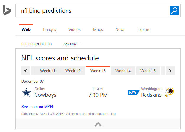 Today Washington Redskins are hosting Dallas Cowboys. The game is set to begin in about 4 hours. Bing predicts a 53% chance for the Washington team to win the game. That, of course, means a 47% win probability for the Cowboys.