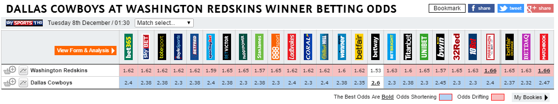 Here’s where it gets interesting. Cowboys’ odds have been shortening the last few hours. Check the following chart, again by OddsChecker.