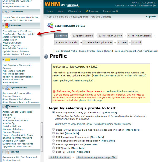 Running a website on Apache meant I had to go through some code that I wasn’t familiar with. Fortunately EasyApache is there to help newbies like me who are also afraid of messing with server settings. At first I was quite skeptical as to what EasyApache does exactly, but it turns out to be a rather safe route to begin optimizing your server. First you have to find it through the tens of options that your WebHost Manager offers.