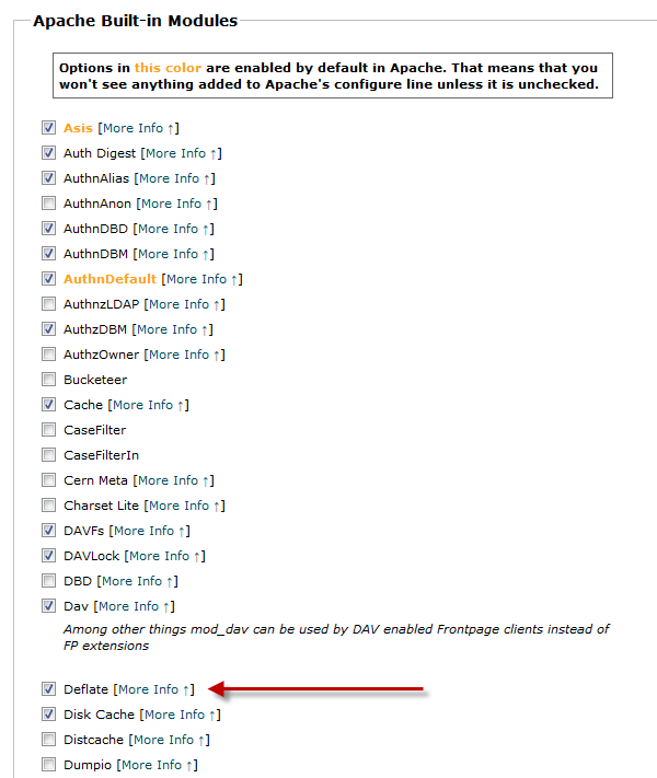 Notice that there is already a default profile loaded by your hosting provider. So we just have to add Gzip compression in that profile, save the profile and build the profile. The tricky part is that there is no clear “enable Gzip compression” option to just tick it! The module you are looking for is called Deflate (mod_deflate) and isn’t included in the short options list you get to see when you first access the EasyApache! Mod_Deflate is found in the exhaustive options list as a built-in module that is waiting to be enabled! Enabling Gzip compression means enabling mod_deflate, saving and building the profile. Building will last about 30 or minutes and you still have access to your websites the whole building time. I guess if something goes wrong, you can revert back to your default profile that had no errors.