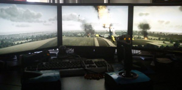 I have always been a PC gamer but never a huge fan of flight simulations or racing games. Owning a multi-screen setup and watching some Youtube videos made me realize the gaming potential of a triple monitor setup, which up to now has been used only for work. Although the PC is not a high-end machine, it gets the job done easily. An ATI HD5770 powers and extends the desktop workspace on 3 Dell 24’’ monitors, allowing ATI Eyefinity technology to push screen resolution up to 5760×1200. Up to now I got hooked to Wings of Prey and iRacing.com simulators both of which are very addictive games!