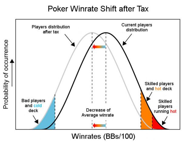 While money-losing players will experience heavier losses, the break-even player will gradually turn into one of them! The bell curve of the winrate will slightly shift to the left in terms of BB/hour. The average winrate will decrease and in the end, all players will be affected by the new gambling tax. Even professional micro grinders, who will add more tables and drop down a level, may give up as the rake might be too high to overcome as Alex states.