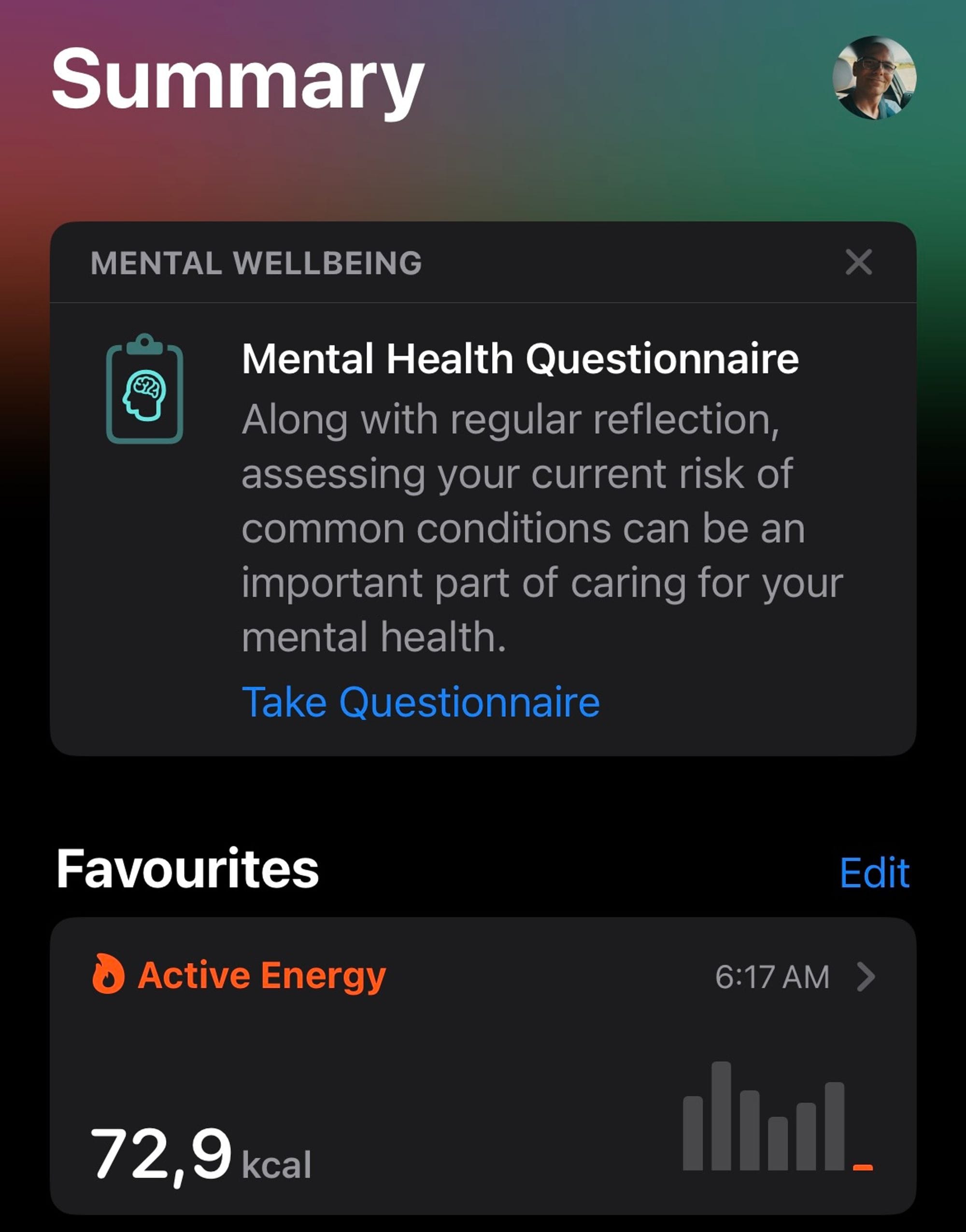 The first time I encountered the condition was during one of my regular morning walks in March. As I was starting out, my iPhone’s Health app (what a GREAT app) notified me that I should take a mental health questionnaire.