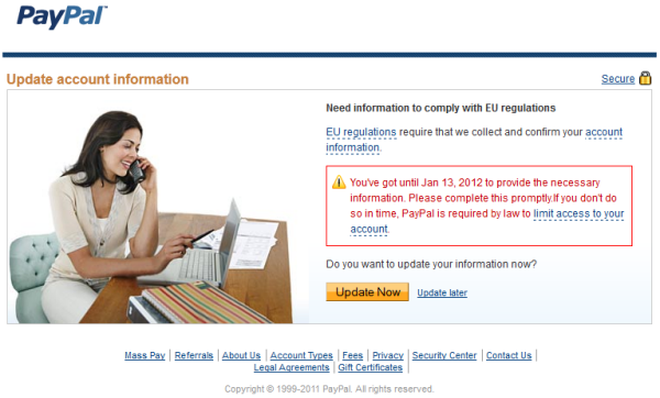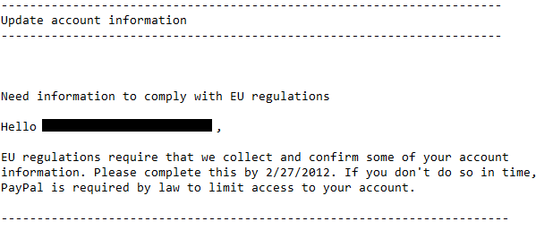 The timeline of complying with EU regulations and verifying my PayPal information began by receiving the email by PayPal, letting me know that I must complete the account update by 27th of February 2012. After making sure it wasn’t a phishing email that needed to be forwarded to PayPal security email address for possible PayPal fraud, I logged in to my PayPal verified account.