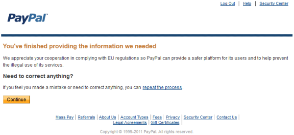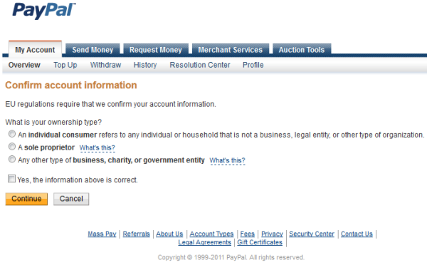 PayPal emailed me today that they are required to limit access to my PayPal verified account if I don’t confirm my account information. EU regulations require PayPal to collect some of their customers’ information, so that they provide a safer platform and help prevent illegal use of its services, such as money laundering fraud. Since my account was already verified, my online research came up with stories about closed PayPal accounts, inaccessible PayPal money and PayPal fraud. In the end it all comes down to answering a multiple choice question whether you are an individual customer, a sole proprietor or some kind of business. Most say that upon answering that question, you’ll be asked to provide identity proof, utility bill as a proof of residence address and link your PayPal account with a bank account and a credit card. I wouldn’t know as I have already done all that back in 2008 when I upgraded my PayPal Personal account to a Premier account.