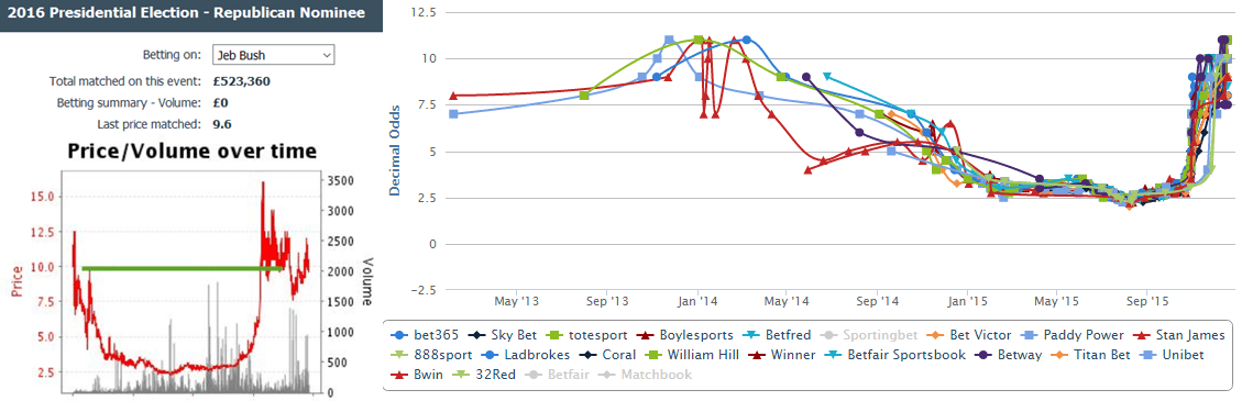 Still, given the price action at the Betfair chart (left), I wouldn’t rule out a surprising decline in the future. As the support level (green line) has failed, maybe there’s a small chance Bush’s odds to shorten the next few weeks.