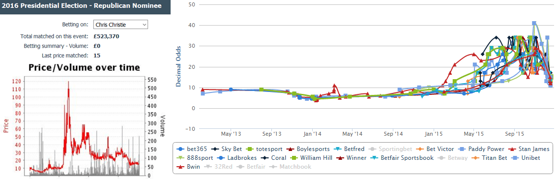 Chris Christie’s betting odds are dropping. BoyleSports reduced them from 15.0 to 13.0. The same happened at ToteSport and BetFred. Betfair Sportsbook was offering Christie’s win at 19.00 and had to bring that down to 13.0 as well. Bwin took that lower to 12.0, while PaddyPower plays it safe at 11.0. 888sport and 32Red’s traders, on the other hand, weren’t keeping up apparently, as their moneyline on Christie was at 34.0 last week, the highest odds by a mile! I am sure sharp bettors taught them a lesson and snatched those odds before they reduced them to 15.0. At this time, the highest odds for Christie’s nomination are found at Coral.