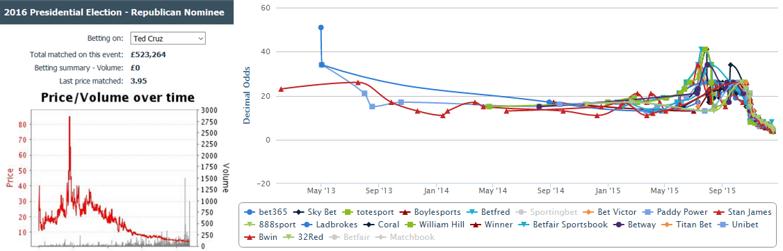 Trump is actually in third place at Betfair’s exchange where his odds trade at 4.80! Cruz is currently the second favorite in the most reliable betting exchange while all other sportsbooks place him third. Who’s wrong, Betfair traders or traditional bookmakers? I vote for the latter.