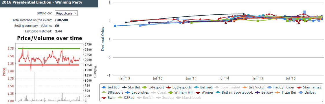 Odds of Republicans winning the Presidential race drifted 0.10 points worldwide since Tuesday. Any bookmaker that had them priced at 2.10, is now offering 2.20 for the Republican win. BetVictor and StanJames offer 0.05 more, yet the price action doesn’t suggest a mind-blowing shift in momentum. Odds are still trading inside that well-defined channel, quietly moving sideways. Until handicappers push odds beyond either band, we will have to wait.