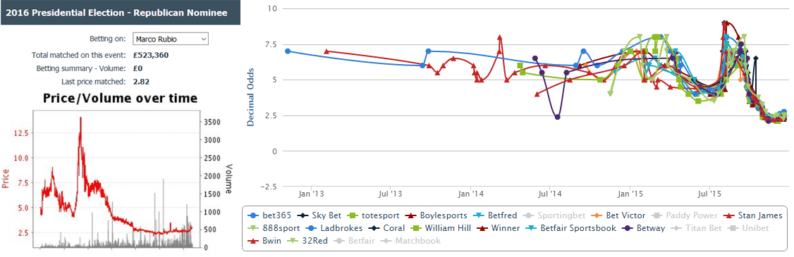 Rubio’s odds are drifting at every sportsbook online. Before the debate, bookmakers offered his win at around 2.30 on average. Today they all pushed that to at least 2.50, Ladbrokes being the most generous ones to be paying 2.75 on your money. The drift can also be seen at Betfair’s chart (left).