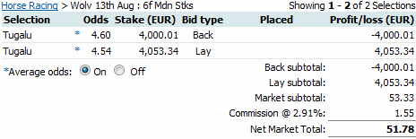 Today in Wolverhampton Racecourse I traded “Tugalu” horse and made EUR53. The odds didn’t drift nor steam but rather hovered around 4.50. Yet, there were some nice scalping opportunities which could be exploited in order to make money before the horse race even went off! Here’s the video capture of my trading moves made with Bet Angel Professional.