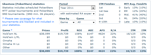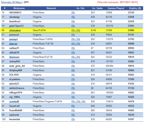 According to official poker rankings, I have won $25,000 in online poker tournaments in 2011. That places me 80th in the Greek online poker rankings of this year, although they don’t track my Ongame results, leaving about 3K out of the equation.