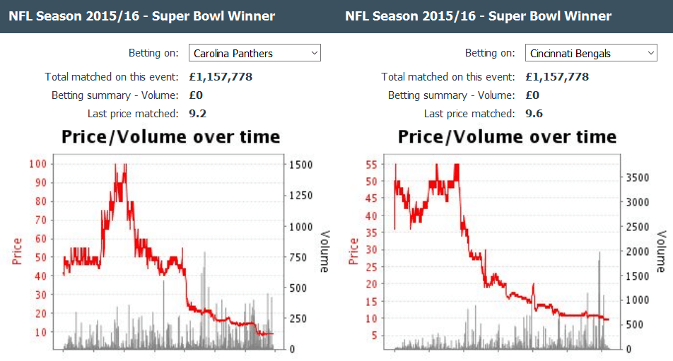 Momentum doesn’t seem to be lost at the most popular betting market either for the New England team. Odds there are trading at 3.65 and while that may sound too short, you are in fact betting on a very strong trend. You should blame bad luck if you bet on Patriots right before a trend reversal following such a strong move!