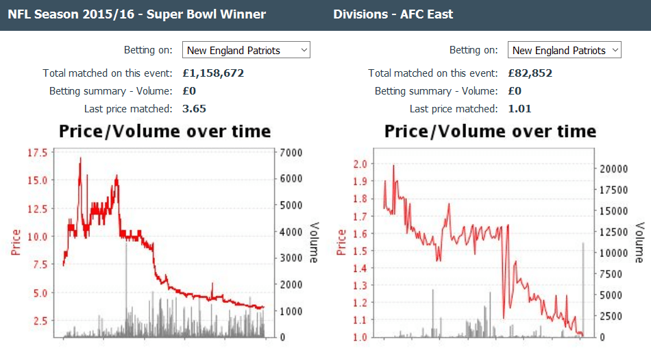 Two markets prove the most popular among NFL betting at Betfair in terms of betting volume: the Super Bowl Winner and the AFC East winner. The odds have hit rock bottom at the latter but it’s worth to note how the odds literally collapsed there. Judging by the chart on the right, Patriots weren’t once threatened to lose momentum as bettors drove their odds lower and lower.