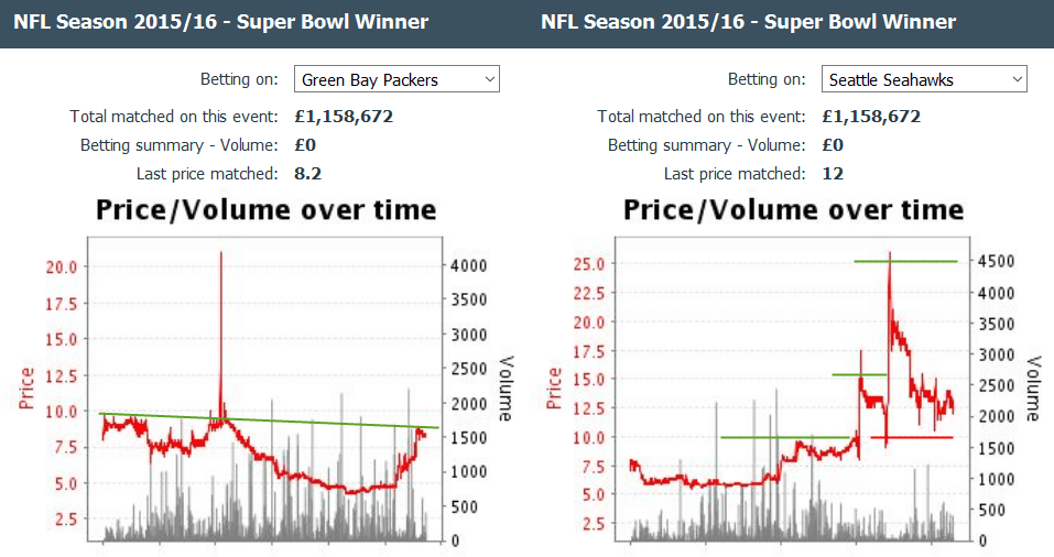 Green Bay Packers suffered quite a loss in terms of odds moving upwards. Although odds declined below 5.00 at one point, their trend is currently pulling back if not reversing. It’s this kind of pullback/reversal you need to be cautious of, when deciding to back Patriots. Yet, Packers’ odds do seem quite tempting at this moment. As they are closing the all-time high (10.0), betting on Green Bay doesn’t sound all that out of place. You may either exit the trade at 11.0 should the resistance level fail, or take profits if the trend resumes. Besides the crowd is waiting for Packers to win their trust back, so any bad outcome for Patriots may result into punters jumping on Packers once again, forcing their odds lower.