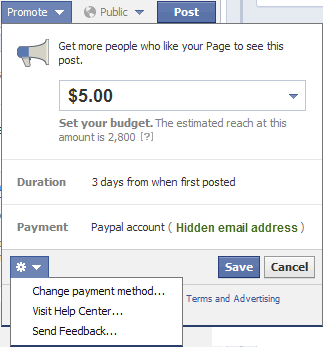 You either need a credit card, a Paypal account or a Facebook Ad Coupon. It’s quite understandable that promoted posts are in fact a kind of advertising, so no surprise there. I find a bit disturbing though the fact that charging your credit card or Paypal account is just a simple click away! Instead of clicking on “Post”, you click on “Promote” and “Save”. Voila! You have just been 5 dollars poorer!