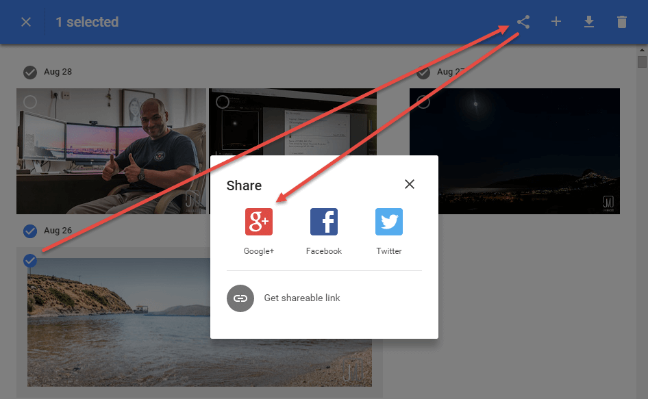 - The final, edited photo is available at Google+. I go on and share the photo automatically to Facebook, Twitter and LinkedIn, as explained (Friends+Me service).