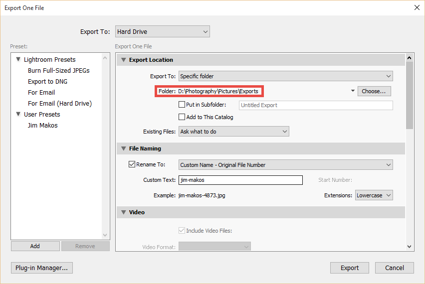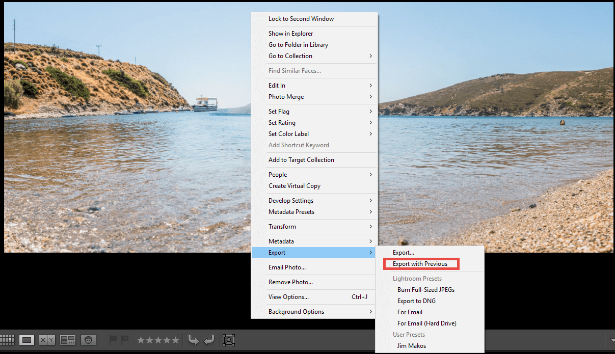 In this example’s photo, I right-clicked and chose to “Export with Previous”. According to the export settings, the photo is exported in high-quality JPEG format in that very folder.