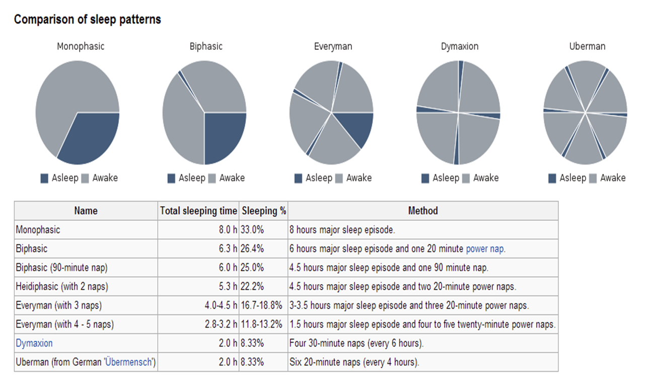I had no idea until I read about Everyman Sleep and Uberman Sleep. These are all polyphasic sleep patterns. Even the lifestyle of Mediterranean/Latin American people, who sleep 5-6 hours at night and take 90-min āsiestasā in the afternoon, is one of them (biphasic pattern). These types of sleep patterns simply change the time and interval between naps and the core sleep. Thus, they beg the question: what kind of polyphasic sleep your lifestyle can adopt?