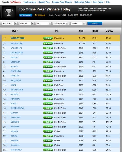 According to pokertableratings.com, my performance at 100NL tables today was top notch as I won 12BB/100 for almost 7,000 hands. Compared to all players from the most popular poker rooms I managed to make the most and be the top winner at 100NL for the day.