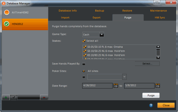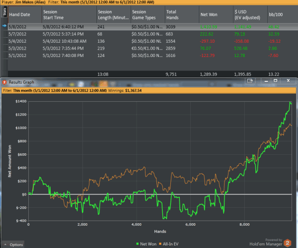 Holdem Manager software meanwhile has a couple of issues lately, most notably the inconsistency between the poker stats and EV graphs. Many forum posters over at HEM website complain about the wrong EV line at the graphs. I also noticed that bug and we are told that it will get fixed in future updates. Yesterday there was a new update announced but doesn’t seem to take care of this problem. However there was a worrying intro text in the update pop-up window that let us know we had to re-import hands since update number 6745 due to stats being imported wrong! An update that rolled out on April 27th! That is quite unacceptable, as it means I have to re-import all hands since the format took place in May! Other HEM users won’t have such a big problem; they just need to purge their databases using a data range from April 26th to today’s date. Thankfully I haven’t deleted the poker hands which are kept in a third hard disk (true, I’m well organized!).