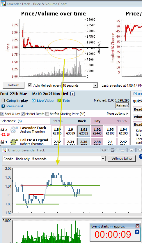 Starting out, Lavender Track was the favorite in the race at 16:10. There was a support level at 2.00 as I have shown in the previous article, which converted into a resistance level afterwards. A part of the original betfair graph is shown in the betfair candlestick chart below, since the drawing of that chart is done in real time and as long as I watch the specific horse race. During the last 10 minutes before the off, there is a down trend up to 1.85 which is instantly defined as the odds support level. In the following minutes the odds retrace to 1.90 which is then defined as the resistance level. The odds are ranging between 1.85 and 1.90, verifying the support level at 1.85 but they break the resistance found at 1.90. At that exact moment it is an excellent opportunity for a profitable trade, taking advantage of the imminent uptrend of course. The red resistance line at 1.90 will be converted into a support line (green) which will be also verified towards the end of the chart. Additionally, the already established resistance line at 1.95 is overcome and has become a support line. However, the odds climbed up to 2.00 where they found the resistance level we had drawn in the main Betfair graph and fell back. At that point it was another good chance to make money trading the downtrend, since it is very rare to break a support or resistance level which is verified in the long term Betfair graph. Backing at 2.00 and laying at 1.95 would secure some profit, while a more risky Betfair trader would have waited and closed his trading position a little lower, towards the next support level found at 1.90. Personally I lost money trading this horse race since the third time the odds touched 1.90 during the first quarter of the chart, I backed the horse with the intention to lay at 1.85, but I picked the wrong time to do it as the resistance was broken. When something like this happens we have to get out as fast as possible. It wasn’t my only trade in that race, but it was the one that cost the most.