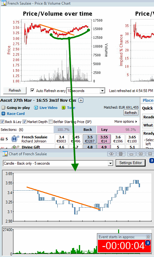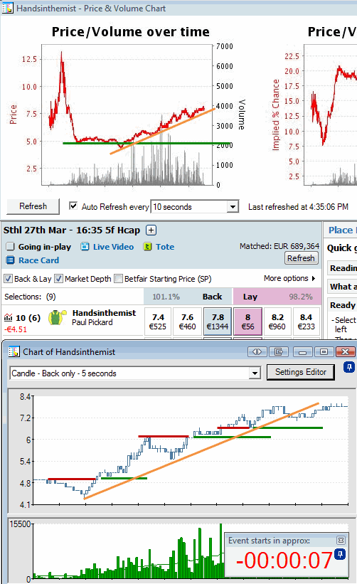 So, we examined 5 horse race more applying technical analysis and using candlestick charts with much more detail. Although we haven’t talked about their advantages, we proved that they provide a lot more information in their formations, which can lead in better trading predictions in Betfair. For yet another article we commented on the basic principles of technical analysis such as trendlines, support and resistance levels and I firmly believe that they should be considered as a big help in predicting the odds movements in Betfair. Next time I’ll be focusing more in the candlesticks charts and formations that the Bet Angel trading platform offers to Betfair traders.