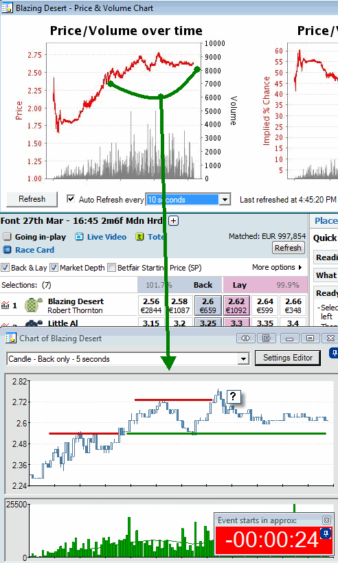 At 16:45 the favorite horse’s odds were in a strong uptrend right from the beginning as the Betfair graph shows, but the trend was gradually losing speed. During the 10 minutes we are interested in, the resistance of 2.50 was broken and become the support (green to red line), which helped us in our future trading. I believe the odds bouncing off that support line offered a great chance for profitable trading by laying first, having already been verified as a resistance level during the uptrend. On the other hand, I also believe there was a trap at 2.74 when the resistance line was broken for just 2 ticks but the odds didn’t move any higher than that. That formation alone was a major indication that the uptrend had ended. That odds movement reveal a last attempt made by layers to move the odds even higher, but they were unable to do so due to the backers’ orders.