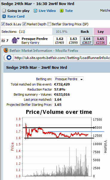 In the next horse race, the horse called Presque Perdre started the race at 1.64, while the betting odds had previously ranged between 1.75 and 1.60. Once again we had a confirmation of the support level quite a few times, making the trading to seem quite easy laying first and backing later whenever the odds touched 1.60. A second resistance level could have been considered at 1.70 afterwards, although a much safer trading would have been to lay at 1.60 and closing the position a couple of ticks above, securing small profits.