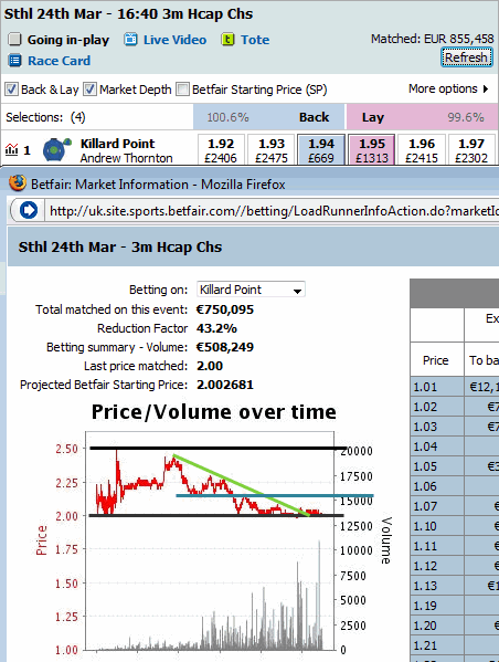 At 16.40, Killard Point offered enough trading opportunities for profitable trading before the start of the race. Right from the beginning we confirmed the resistance level at 2.50 and the support level at 2.00. So, when the betting odds reached 2.45 where the green trendline begins, we could back the horse and make money from the downtrend up to 2.00, while if we were wrong, we would have placed our stop loss at 2.55. In other words we risked 5 ticks to win 20. In the end we would have won the whole downtrend of the odds, although we could have split our trading into smaller trading moves. An example of that is when the betting odds found a support level at 2.20 (blue line). When the odds moved below 2.20, the support level converted into a resistance level. In the main betting exchange interface we see that the betting odds have moved below 2.00 and have reached 1.95, but 30 seconds before the start of the horse race, it isn’t the most appropriate time to open a trading position having very few seconds to complete our trade.