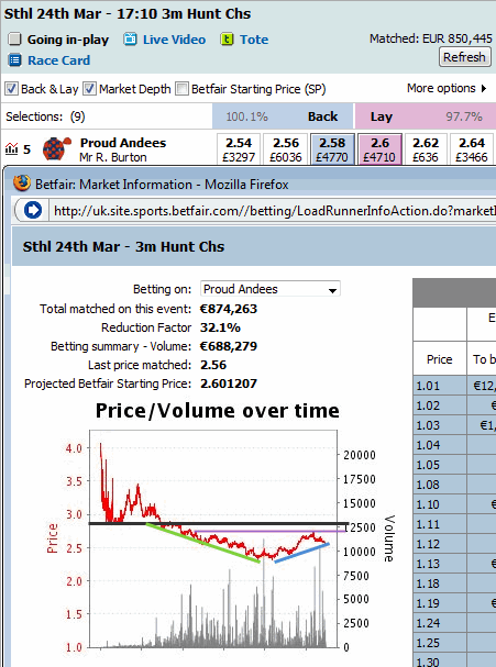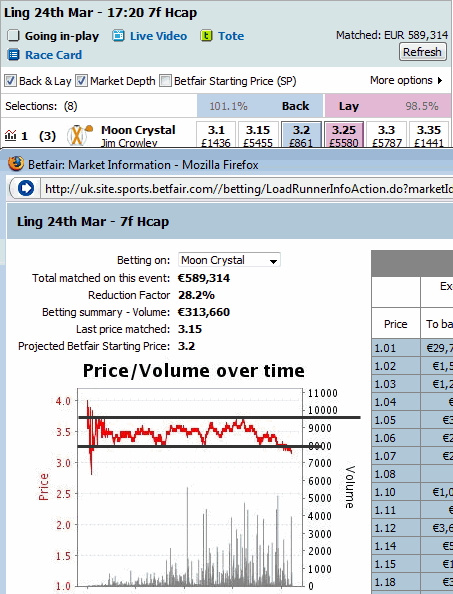 I included 7 betfair graphs from yesterday’s horse racing betting markets in this article and I try analyzing and discussing the various support and resistance levels in them. I used to study about technical analysis in the past years when I traded the Betfair UK Horse racing markets and I applied the same knowledge back then to make about 10,000 euros per month. I’m not sure if they can be applied profitably in today’s markets but they will certainly help you understand and predict the odds movements more efficiently.