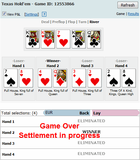 Let’s say we had backed hand1 at 1.40 betting odds. When the turn cards is the 3rd King, we can lay hand1 at 1.20 and secure a profit before the river card. How?