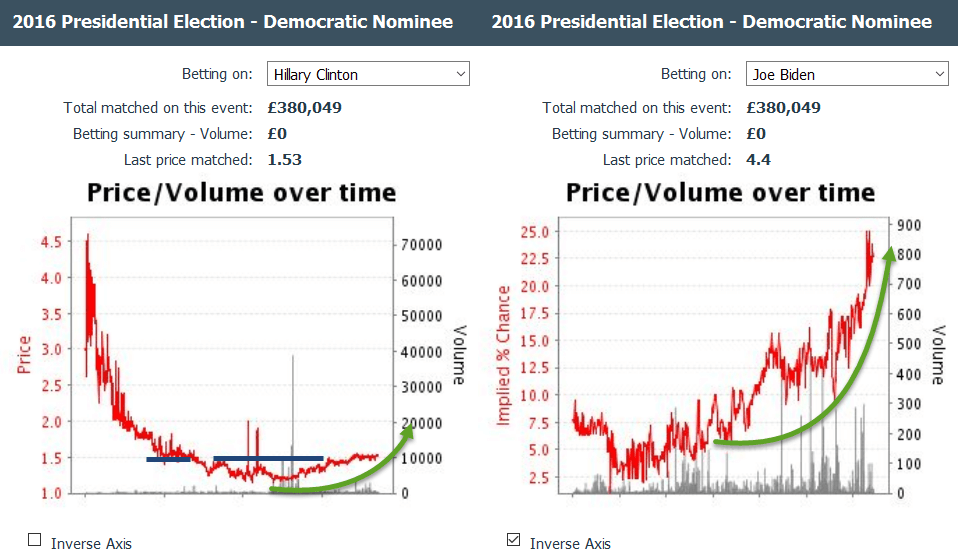 Therefore, on this graph a rise of probability means a drop on the odds in favor of Biden. Since probability is already skyrocketing, a further push upwards on the odds for Clinton as explained above should fuel further expectations in favor of Biden. His probability outlook would propel to new highs, resulting in further drop on the odds in favor of the vice president.