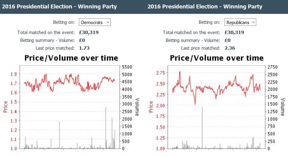 Nevertheless, it is evident that strong resistance does not allow any rise over the 1.50 level. On the other hand, layers try hard to keep the odds moderately high, settling the bets within a short range of 2 to 3 ticks (base points), forbidding in that sense any price to be recorded below the virtual barrier of 1.47. In the event backers are exhausted, we may see a crack appearing on the resistance level, pushing higher the odds on Clinton, which should immediately drive the odds on Biden lower.